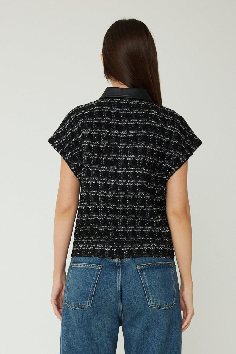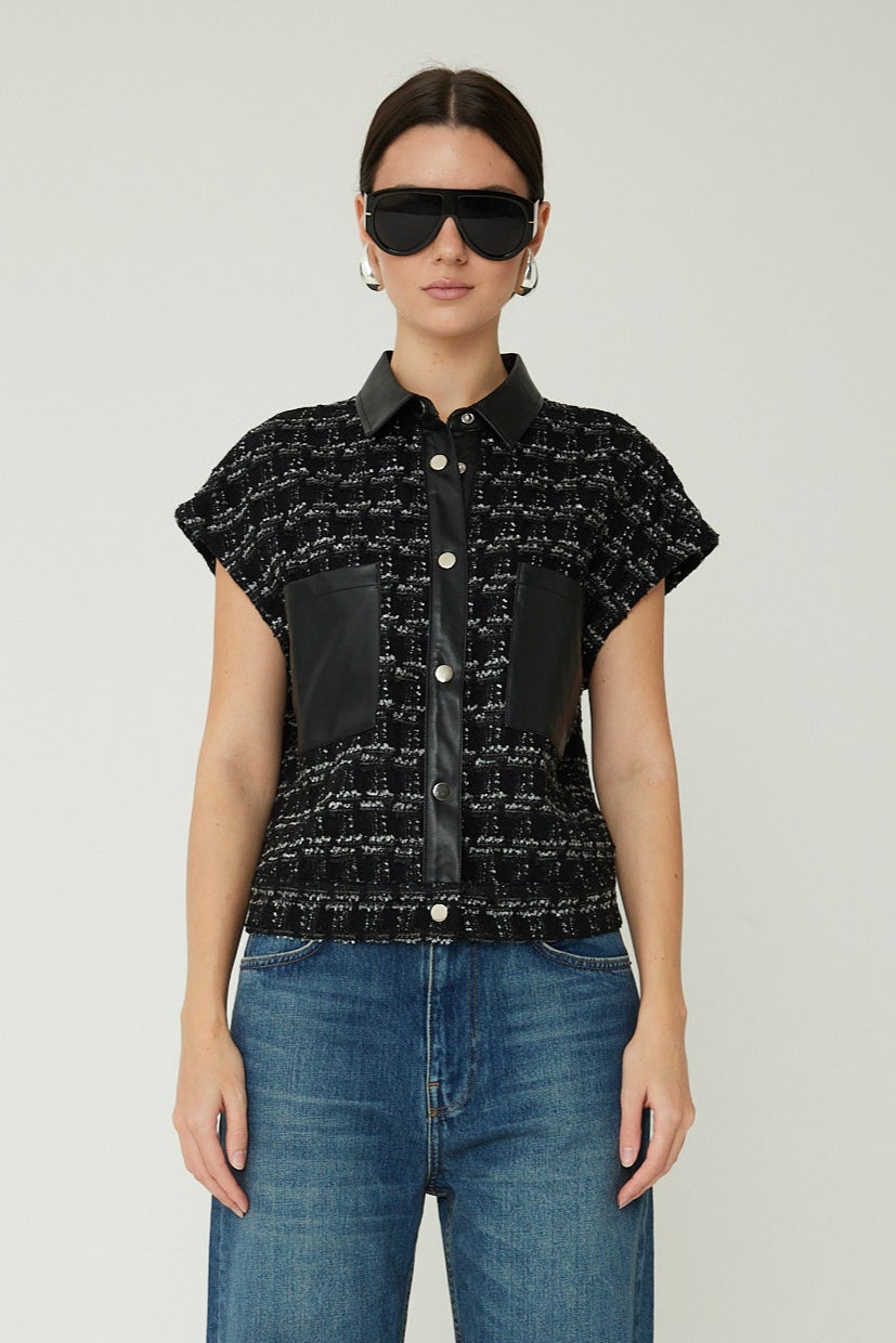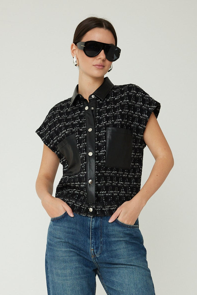 Crafted from luxurious boucle fabric with faux leather accents, the Tyson vest offers versatile styling options. Wear it solo as a chic top or layer it unbuttoned over your favorite shirt or tee.