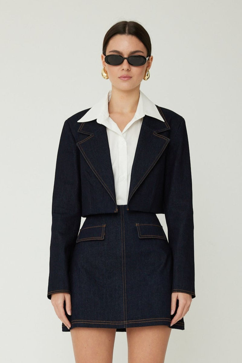The Donita jacket features our signature stretch denim in a deep dark wash. It includes a detachable white dickie shirt underneath, allowing you to style it layered or wear the jacket solo. This sophisticated piece pairs beautifully with the Oxford skirt for a polished look.
