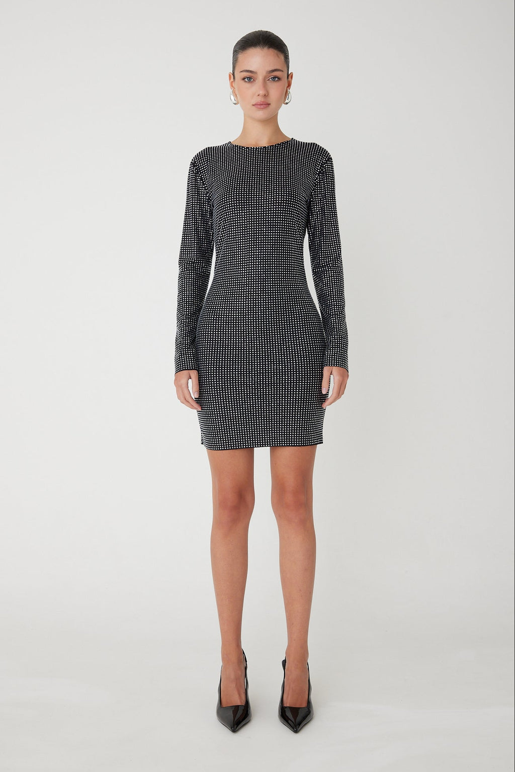 Crafted from stretch fabric, the Hayden Dress features delicate stone embellishments throughout, offering a refined twist on the classic little black dress. Ideal for holiday occasions, it combines effortless comfort with elegant sparkle for a truly captivating look.