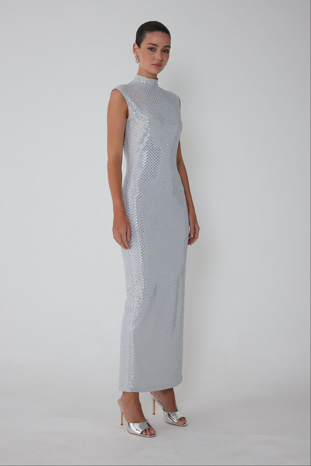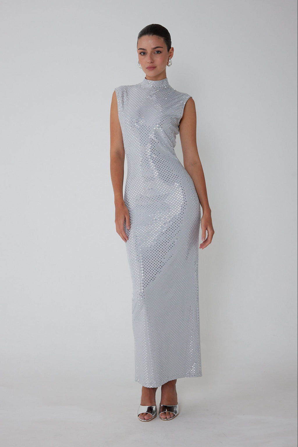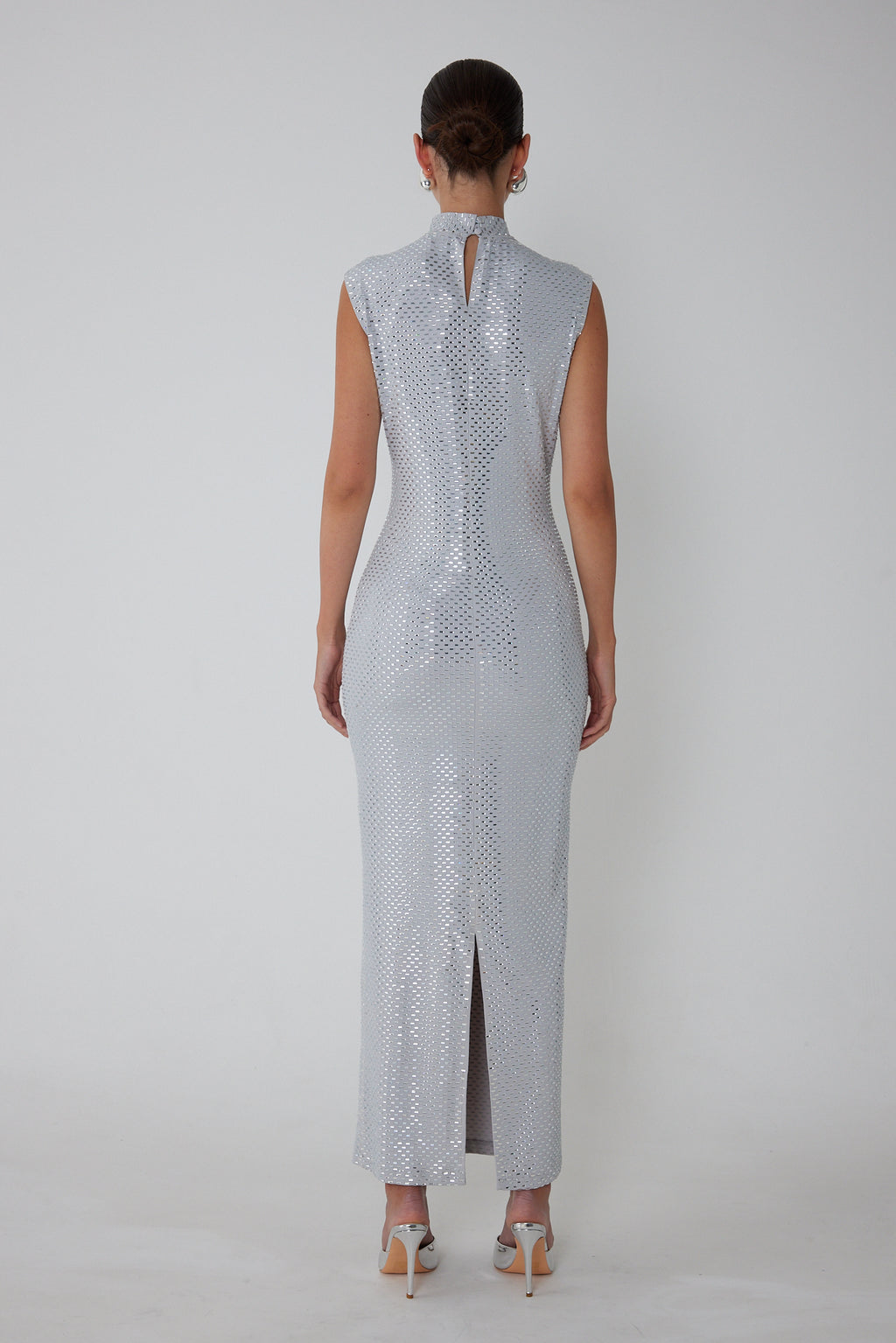 Elevate your event wardrobe with the Kenzie dress, a sophisticated sleeveless silhouette featuring an elegant mock neck. Adorned with delicate rectangular mirrors throughout, this platinum-hued piece delivers an undeniable glamorous presence. Crafted from stretch fabric that moves with you, the Kenzie offers both refined comfort and a flattering fit.